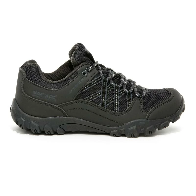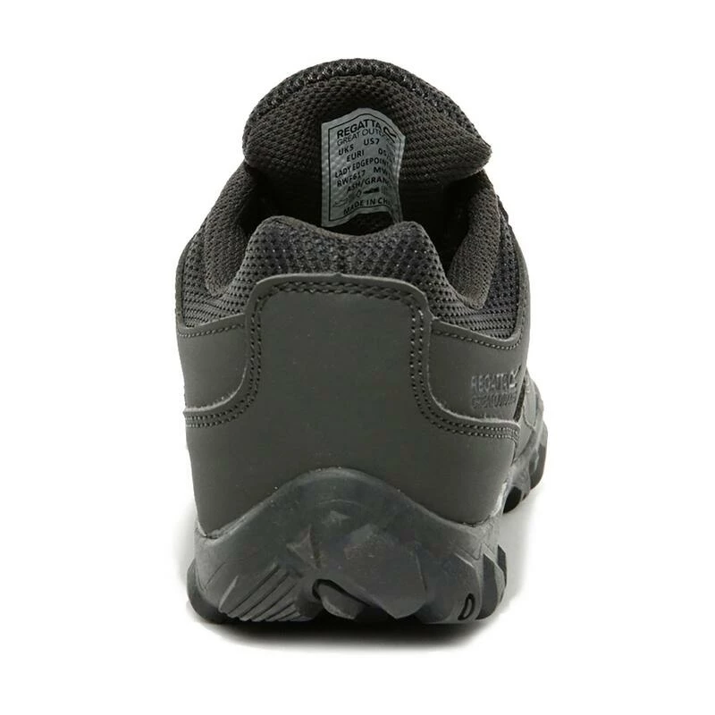De Lady Edgepoint lage wandelschoen van Regatta is waterdicht en ademend dankzij de waterafstotende Hydropel-technologie en een waterdicht/ademend Isotex-membraan met getapete naden. De inzetstukken van rubber en de schokabsorberende EVA-kussentjes beschermen de voeten bij elke stap. Gewicht: 320 gram.