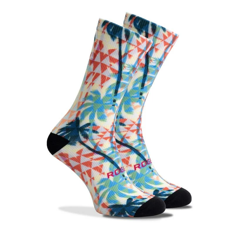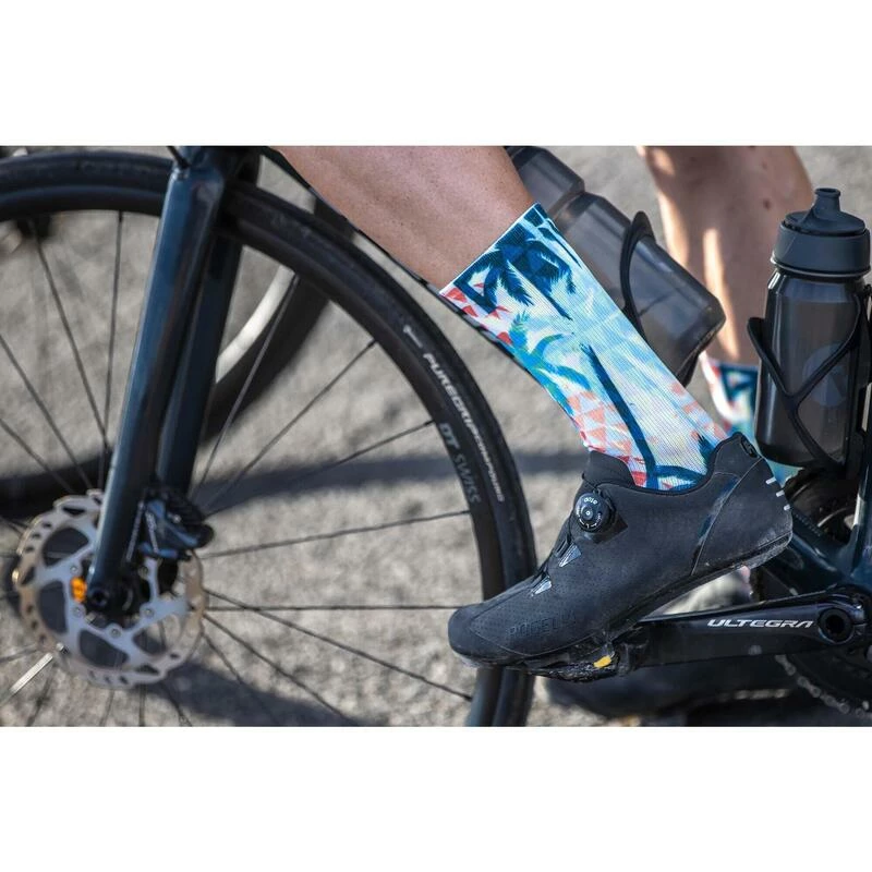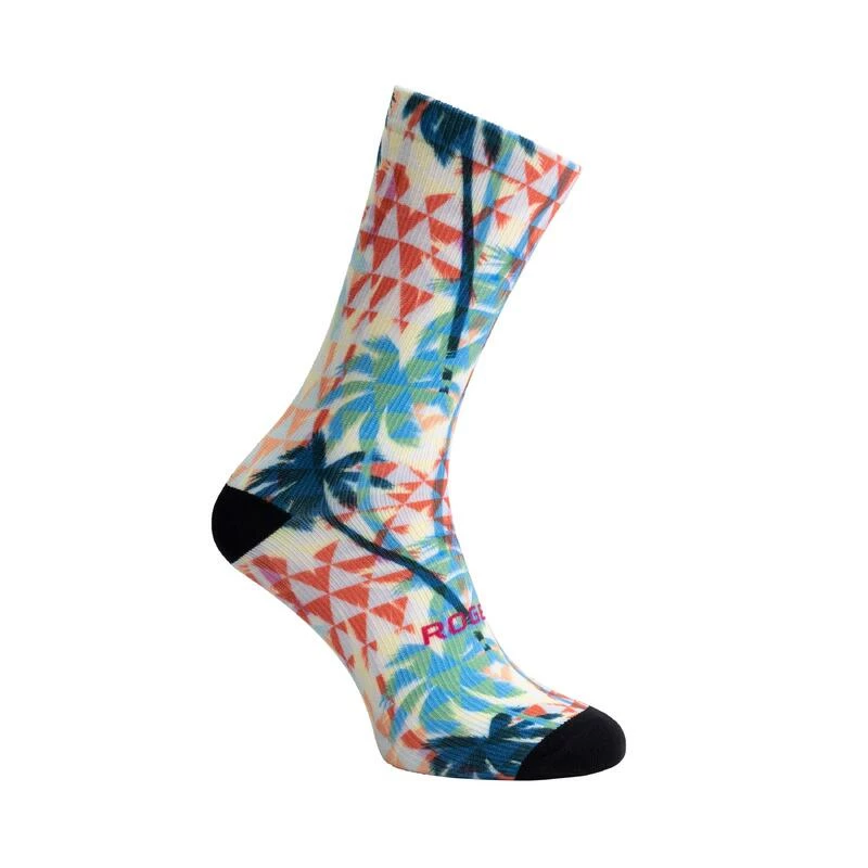 De Hawaii sokken zijn onderdeel van de Rogelli Hawaii set en passen perfect bij het Rogelli Hawaii fietsshirt. De Hawaii sokken zijn bedrukt met behulp van een innovatieve printtechniek, waardoor de print mooi uitkomt en jij gesoigneerd de weg op kan. De wielersokken zijn gemaakt van een elastische Lycra stof en hebben een anatomische pasvorm. De versterkte band rond de wreef biedt extra ondersteuning. Deze versterkende weeftechniek is ook toegepast op de hiel en de tenen. De naadloze tenen voorkomen irritatie.
